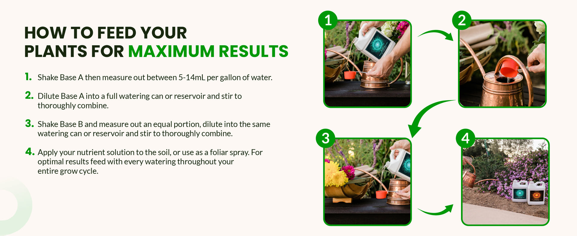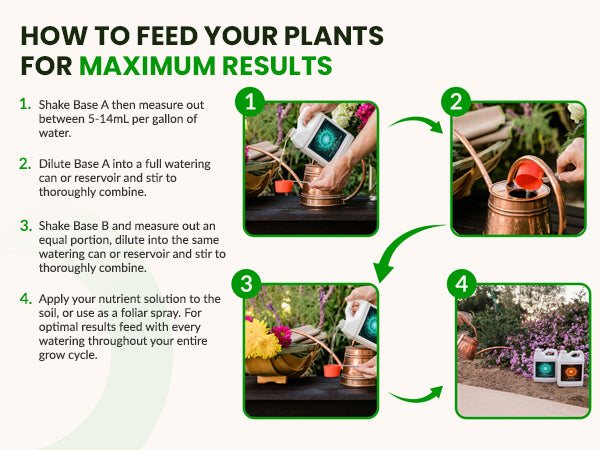 Use 5–14 mL of each part (Base A and Base B) per gallon of water. Choose the right amount based on your plant’s growth stage and size (you can find the information you need in our nutrient calculator).