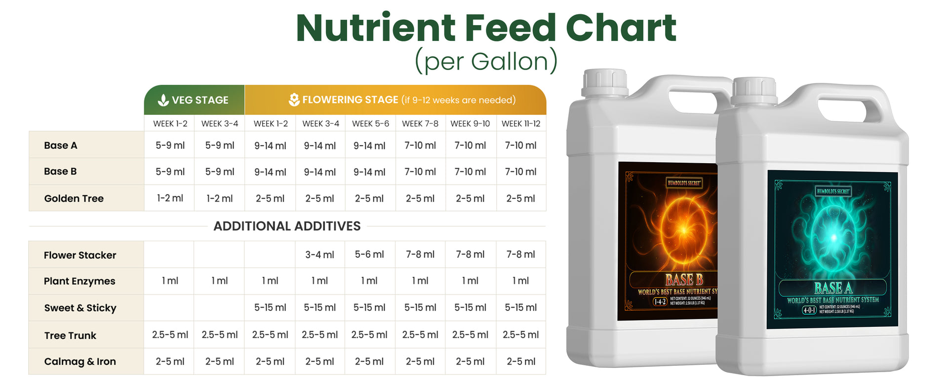Base A & B is designed to be the foundation of your feeding regimen. It integrates perfectly with Golden Tree, Flower Stacker, and the rest of the Humboldts Secret nutrient line.