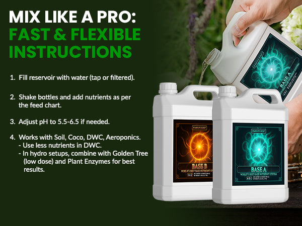 For the best results, start with Golden Tree (if using), then add Base A and mix well, followed by Base B. Stir thoroughly after each step to ensure a well-blended solution.