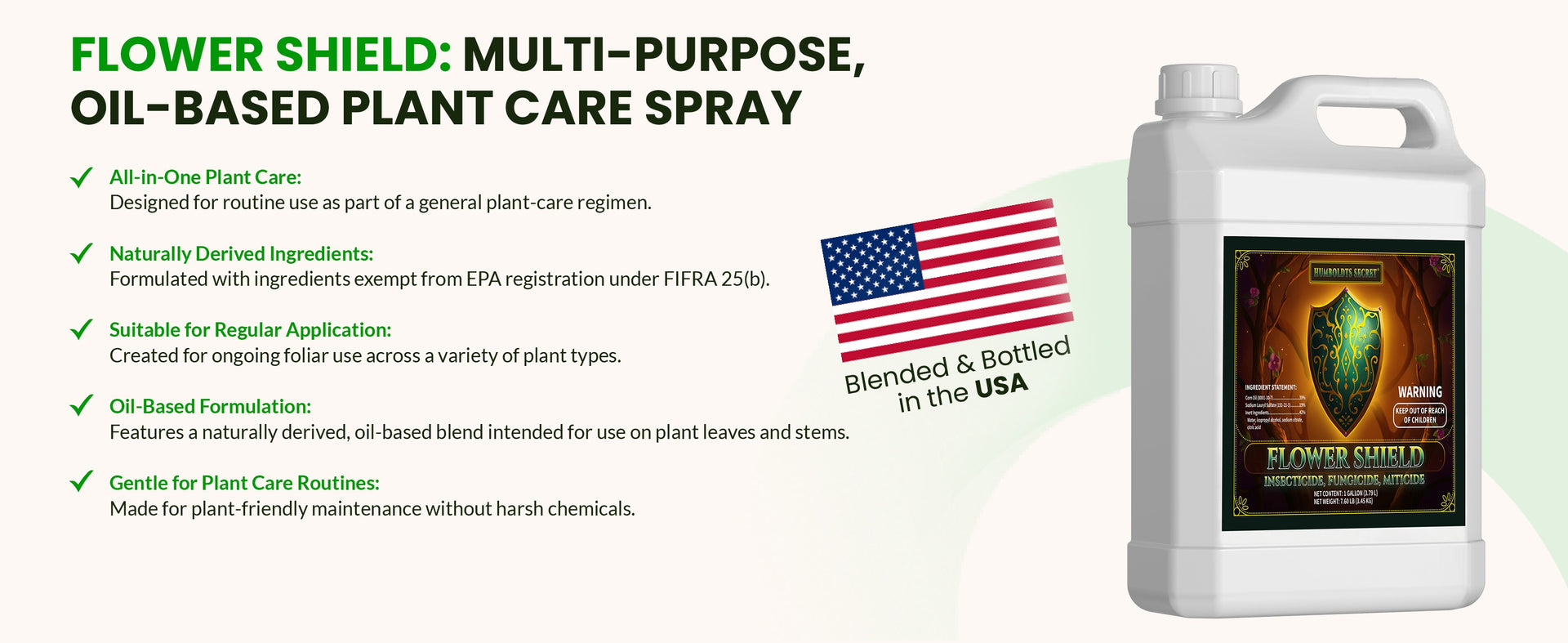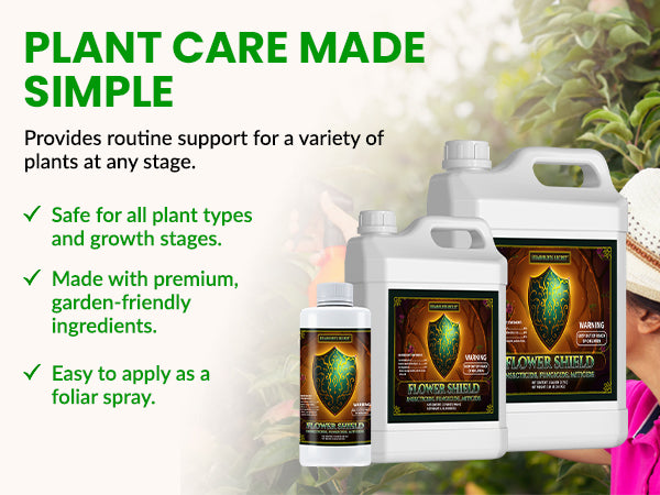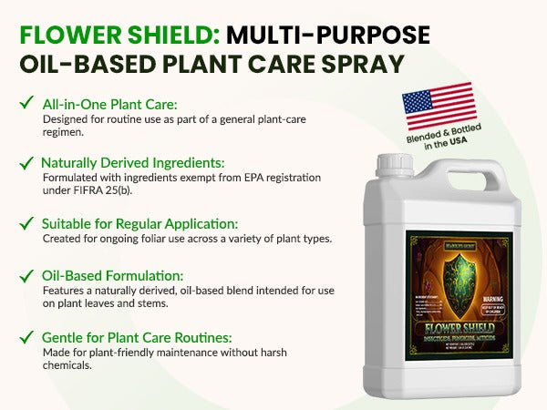 Flower Shield is a clean, simple plant care spray trusted by gardeners who prioritize routine plant maintenance. Formulated with naturally derived ingredients and an oil-based formulation, it supports healthy plants through regular foliar application. This FIFRA 25(b) exempt product integrates smoothly into everyday gardening practices.
