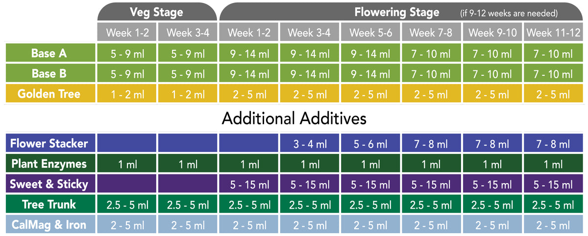 PACK INCLUDES: Grow & Bloom Base A & B, Golden Tree, Flower Stacker, CalMag & Iron and Plant Enzymes.