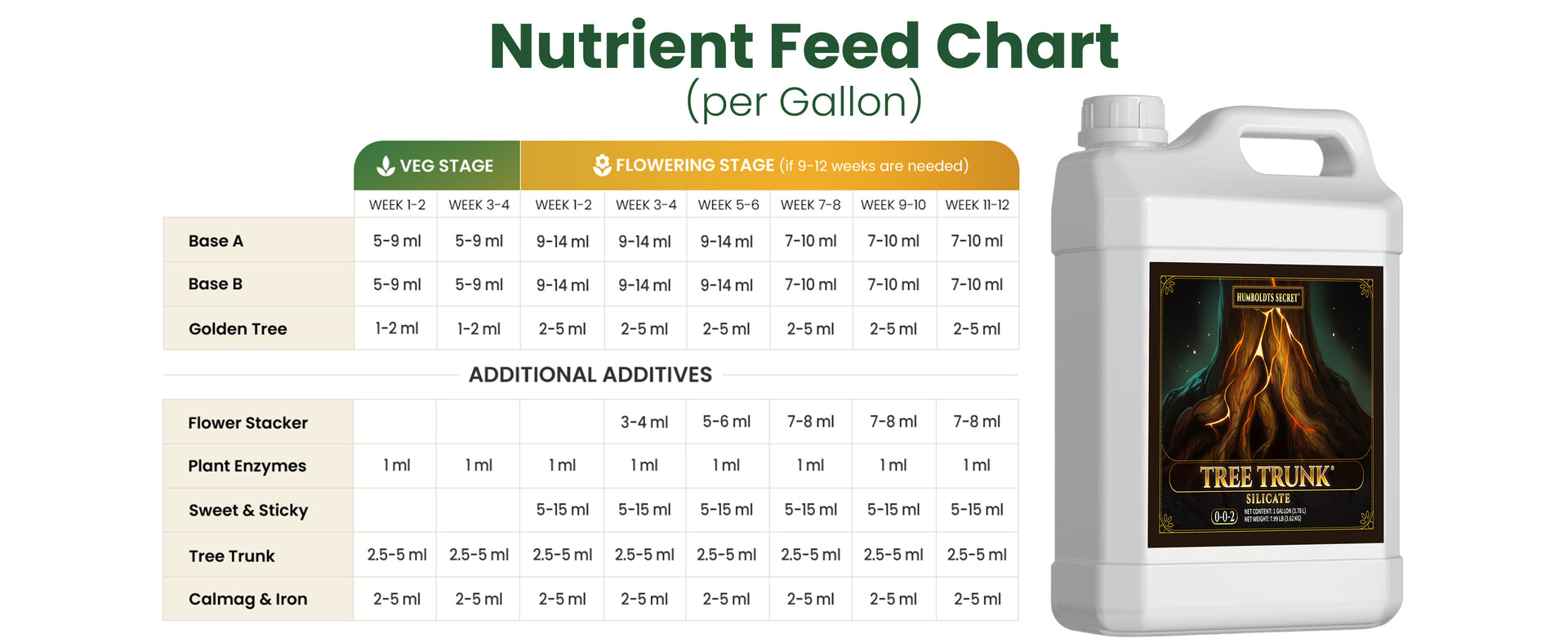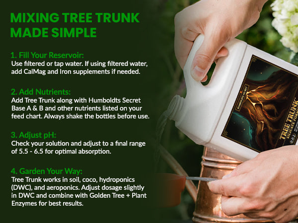 Use Tree Trunk with every or every-other watering throughout your grow. Starting early helps develop a stronger foundation, but it’s also effective mid-cycle to reinforce late-stage growth.