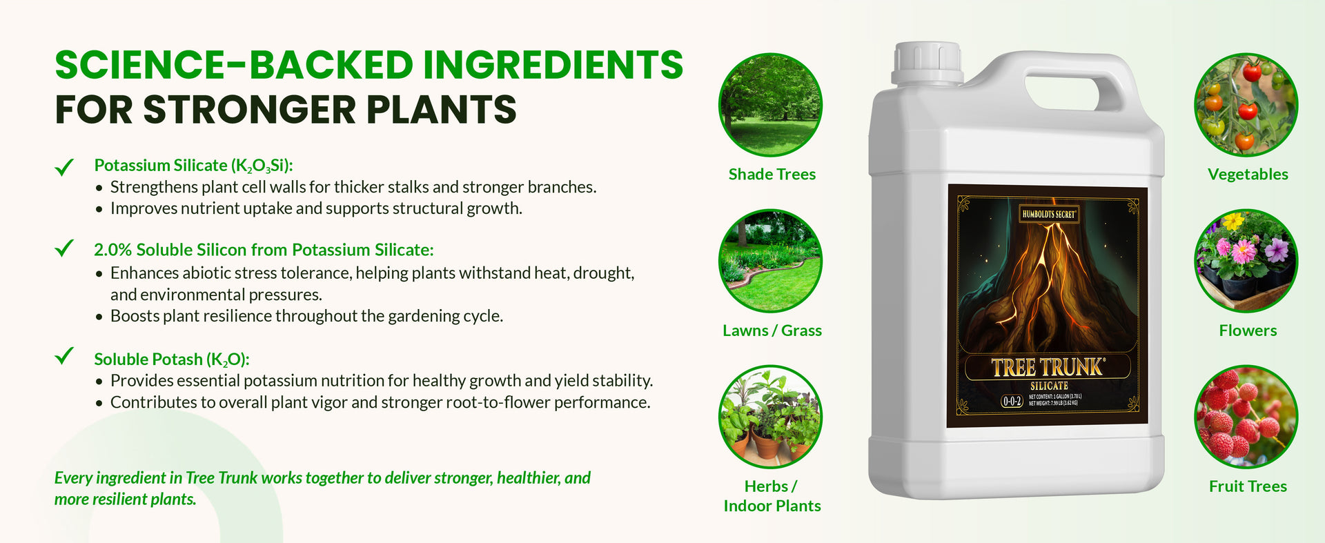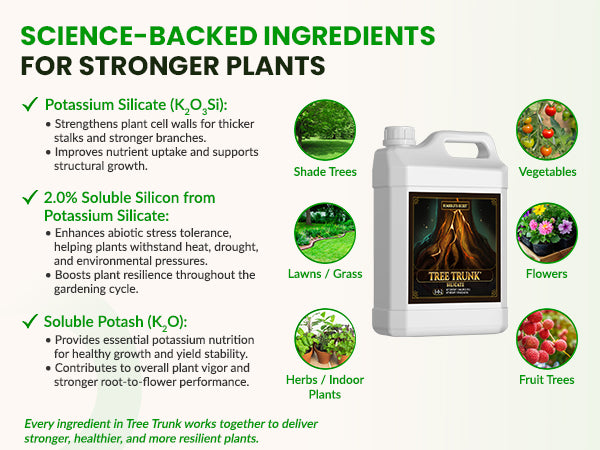 Tree Trunk delivers 2.0% Soluble Silicon from Potassium Silicate — one of the most concentrated, plant-available sources of silica available.